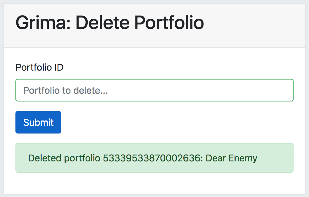 Your grima’s behavior will be specified by its PHP file, like this one for the grima called DeletePortfolio: